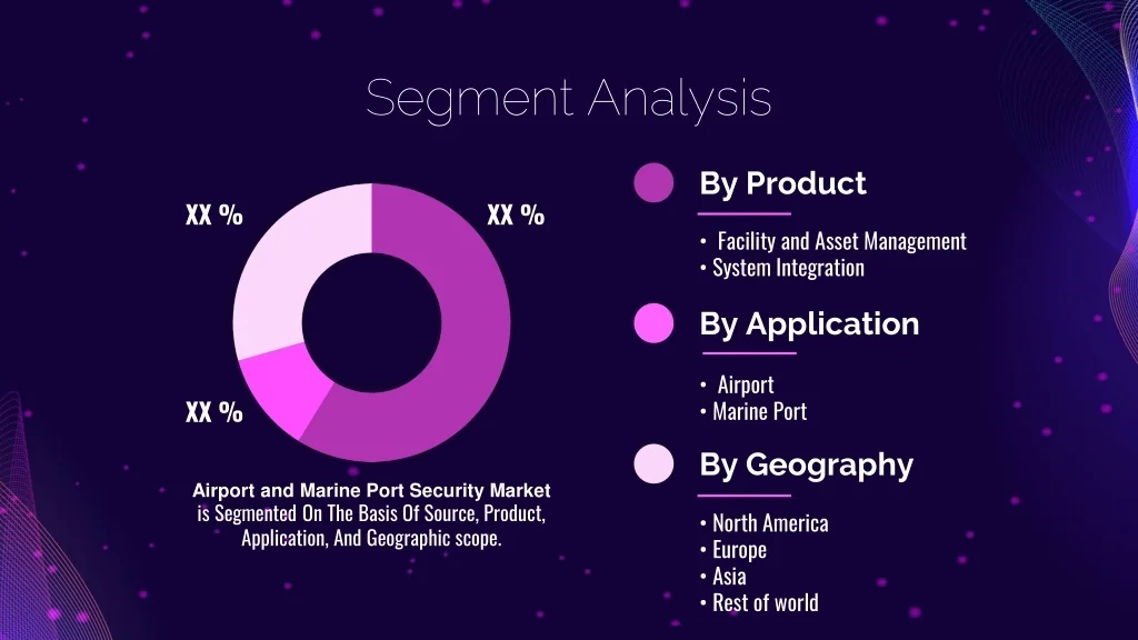 Segment Analysis By Product XX % XX % • • Facility and Asset Management • • System Integration • By Application • • Airport • • Marine Port XX % • By Geography • Airport and Marine Port Security Market is Segmented On The Basis Of Source, Product, Application, And Geographic scope. • • North America • • Europe • • Asia • • Rest of world