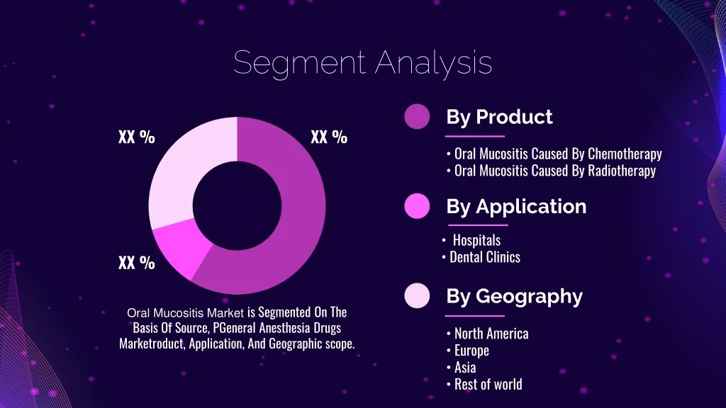 Segment Analysis • By Product XX % XX % • • Oral Mucositis Caused By Chemotherapy • • Oral Mucositis Caused By Radiotherapy • By Application • • Hospitals • • Dental Clinics XX % By Geography • Oral MucositisMarket is Segmented On The Basis Of Source, PGeneral Anesthesia Drugs Marketroduct, Application, And Geographic scope. • North America • Europe • Asia • Rest of world