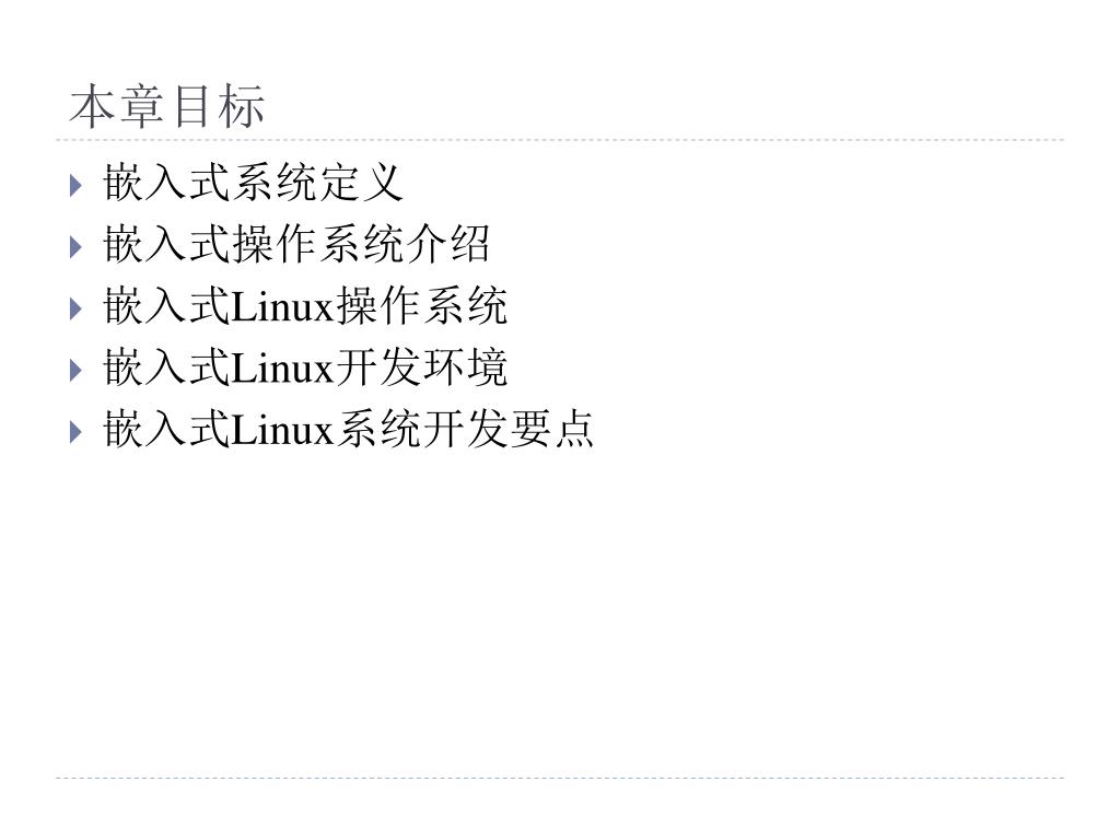 本章目标 • 嵌入式系统定义 • 嵌入式操作系统介绍 • 嵌入式Linux操作系统 • 嵌入式Linux开发环境 • 嵌入式Linux系统开发要点