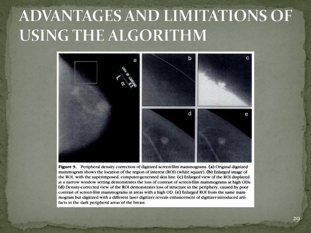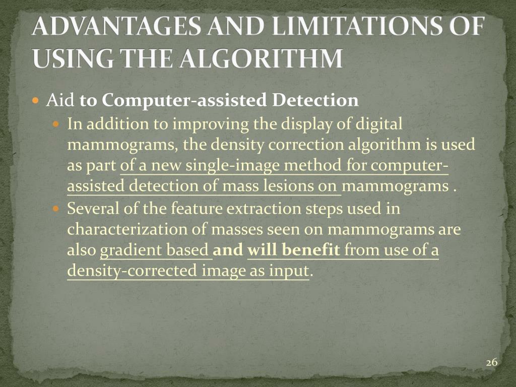 ADVANTAGES AND LIMITATIONS OFUSING THE ALGORITHM • Aid to Computer-assisted Detection • In addition to improving the display of digital mammograms, the density correction algorithm is used as part of a new single-image method for computer-assisted detection of mass lesions on mammograms . • Several of the feature extraction steps used in characterization of masses seen on mammograms are also gradient basedand will benefit from use of a density-corrected image as input.