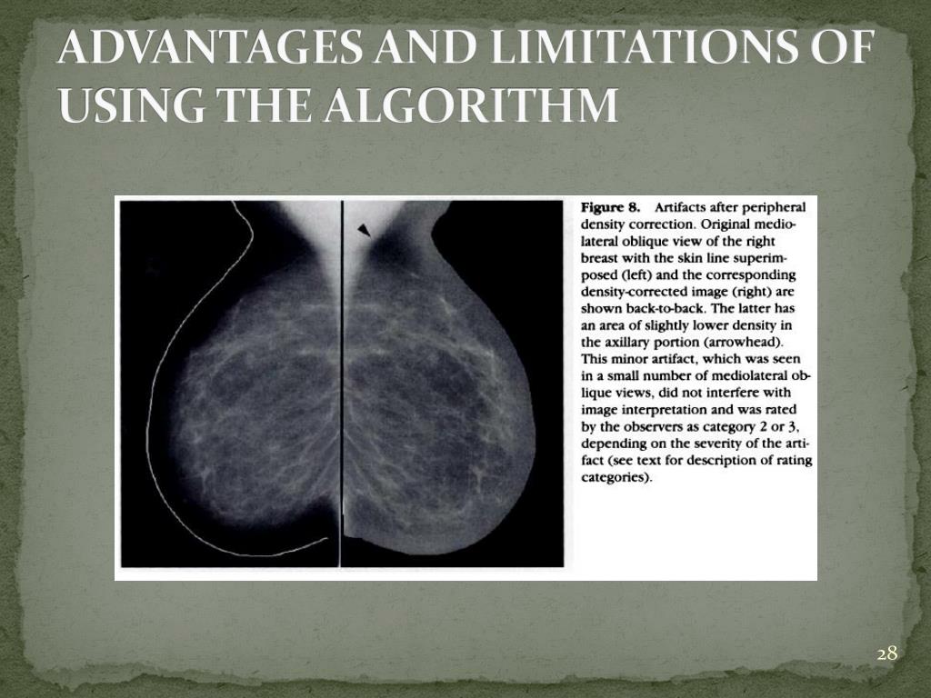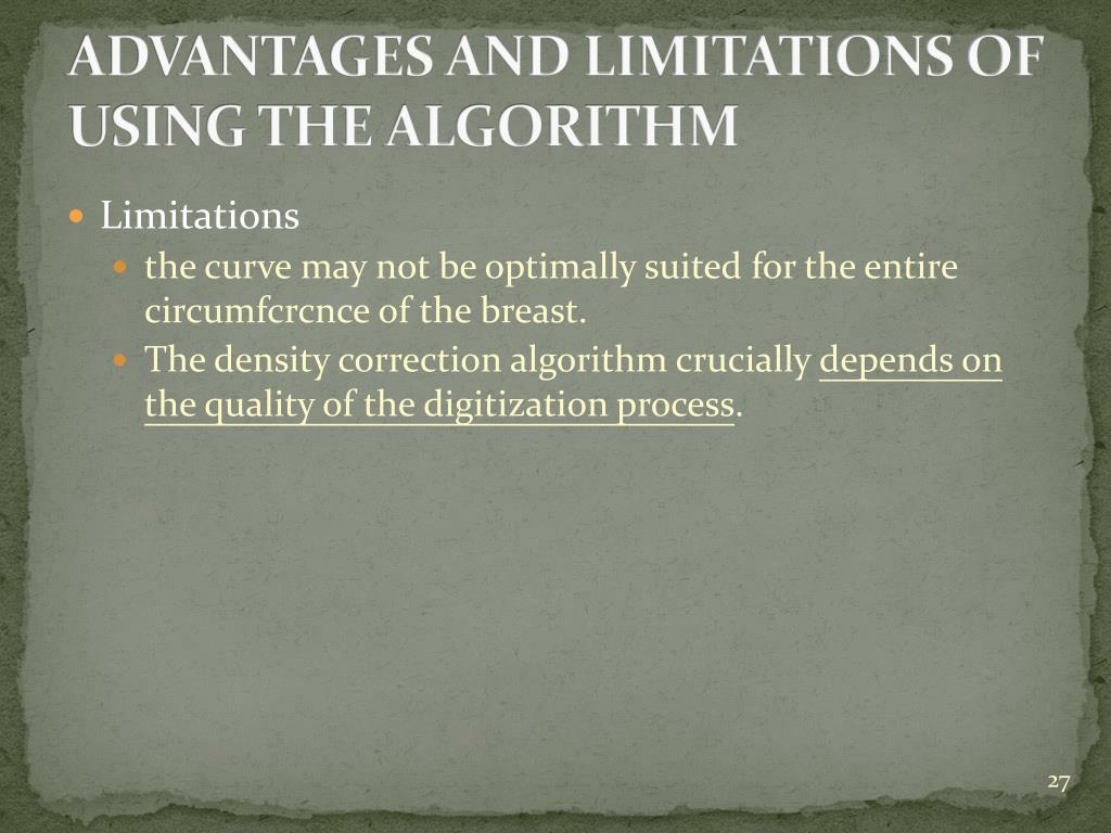 ADVANTAGES AND LIMITATIONS OFUSING THE ALGORITHM • Limitations • the curve may not be optimally suited for the entire circumfcrcnce of the breast. • The density correction algorithm crucially depends on the quality of the digitization process.