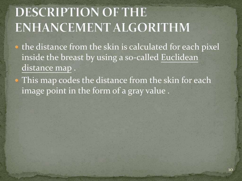 DESCRIPTION OF THE ENHANCEMENT ALGORITHM • the distance from the skin is calculated for each pixel inside the breast by using a so-called Euclidean distance map . • This map codes the distance from the skin for each image point in the form of a gray value .