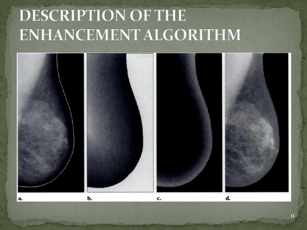 DESCRIPTION OF THE ENHANCEMENT ALGORITHM • After an automated segmentation of the digital mammogram and identification of the skin line