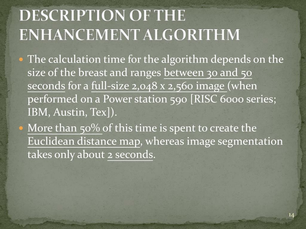 DESCRIPTION OF THE ENHANCEMENT ALGORITHM • The calculation time for the algorithm depends on the size of the breast and ranges between 30 and 50 seconds for a full-size 2,048 x 2,560 image (when performed on a Power station 590 [RISC 6000 series; IBM, Austin, Tex]). • More than 50% of this time is spent to create the Euclidean distance map, whereas image segmentation takes only about 2 seconds.