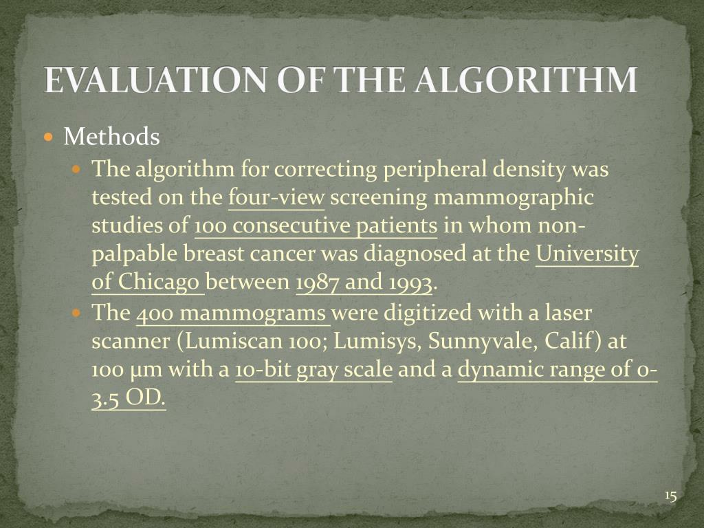EVALUATION OF THE ALGORITHM • Methods • The algorithm for correcting peripheral density was tested on the four-view screening mammographic studies of 100 consecutive patients in whom non-palpable breast cancer was diagnosed at the University of Chicago between 1987 and 1993. • The 400 mammograms were digitized with a laser scanner (Lumiscan 100; Lumisys, Sunnyvale, Calif) at 100 μm with a 10-bit gray scale and a dynamic range of 0-3.5 OD.