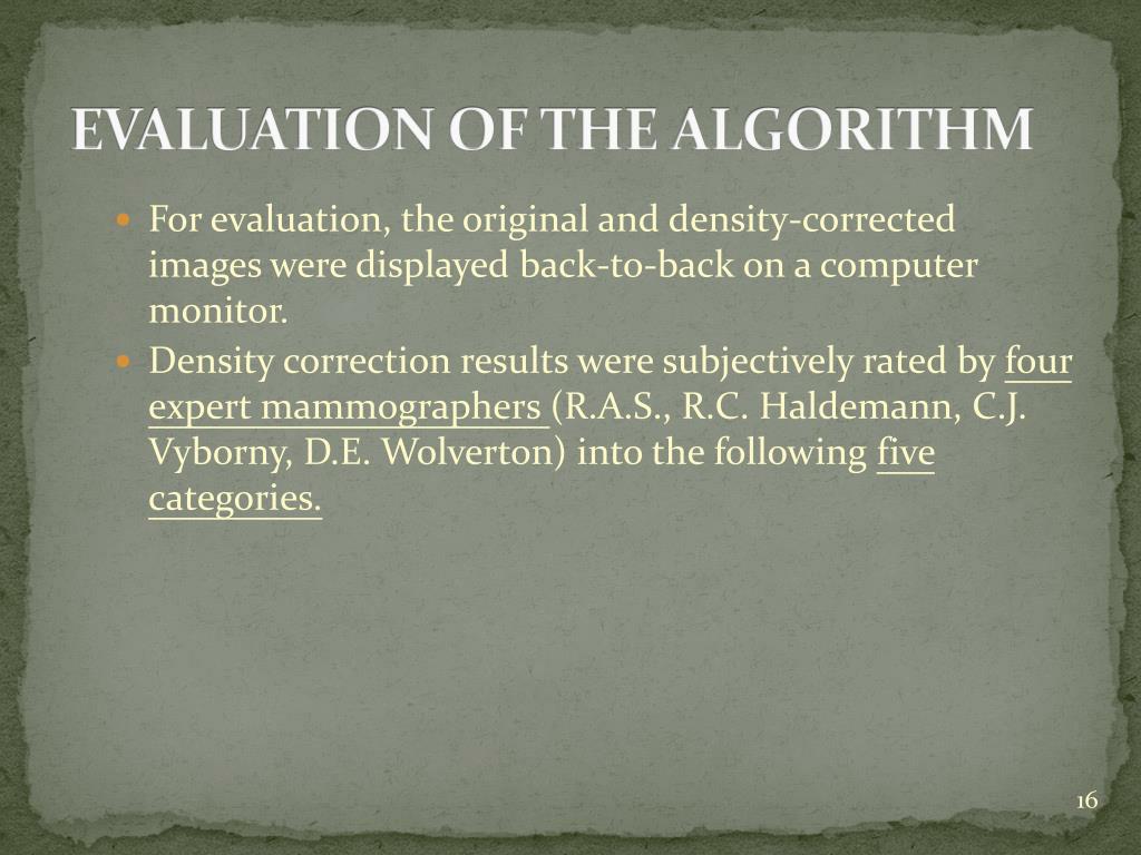 EVALUATION OF THE ALGORITHM • For evaluation, the original and density-corrected images were displayed back-to-back on a computer monitor. • Density correction results were subjectively rated by four expert mammographers(R.A.S., R.C. Haldemann, C.J. Vyborny, D.E. Wolverton) into the following five categories.