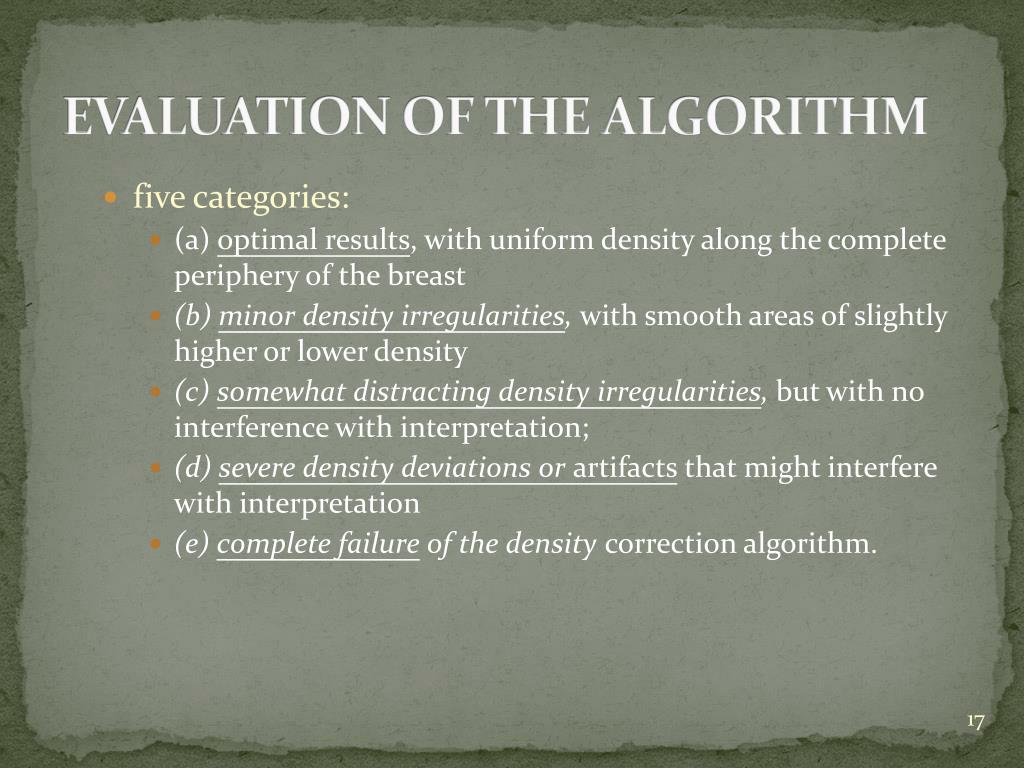 EVALUATION OF THE ALGORITHM • five categories: • (a) optimal results, with uniform density along the complete periphery of the breast • (b) minor density irregularities, with smooth areas of slightly higher or lower density • (c) somewhat distracting density irregularities, but with no interference with interpretation; • (d) severe density deviations or artifacts that might interfere with interpretation • (e) complete failure of the density correction algorithm.