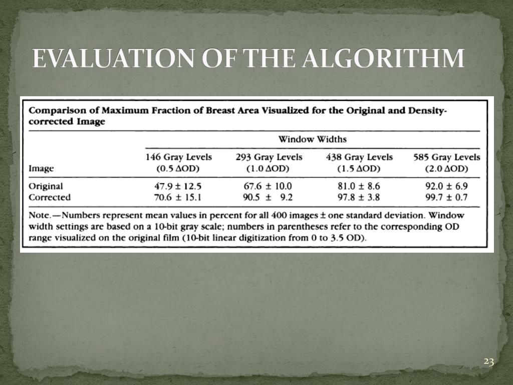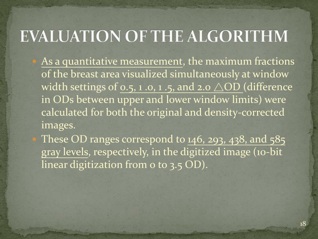 EVALUATION OF THE ALGORITHM • As a quantitative measurement, the maximum fractions of the breast area visualized simultaneously at window width settings of 0.5, 1 .0, 1 .5, and 2.0 △OD (difference in ODs between upper and lower window limits) were calculated for both the original and density-corrected images. • These OD ranges correspond to 146, 293, 438, and 585 gray levels, respectively, in the digitized image (10-bit linear digitization from 0 to 3.5 OD).