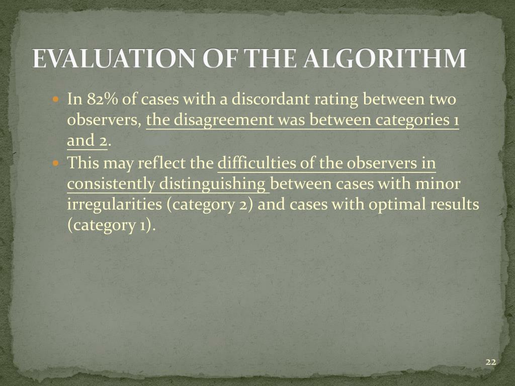 EVALUATION OF THE ALGORITHM • In 82% of cases with a discordant rating between two observers, the disagreement was between categories 1 and 2. • This may reflect the difficulties of the observers in consistently distinguishing between cases with minor irregularities (category 2) and cases with optimal results (category 1).