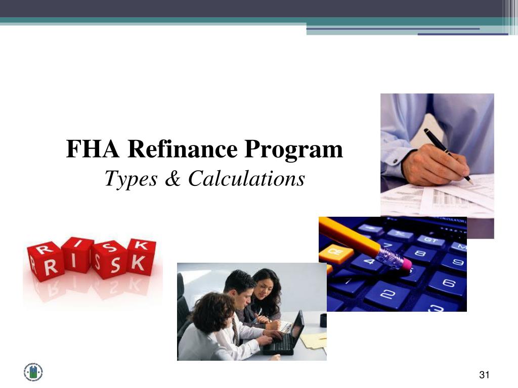 Together we will look at: Loan Limits – Ceiling/Floor Amounts; High-price Limits. Maximum Mortgage Calculations – Purchase loans. Types of FHA Refinance loans & Calculating loan amounts. Course Overview 7