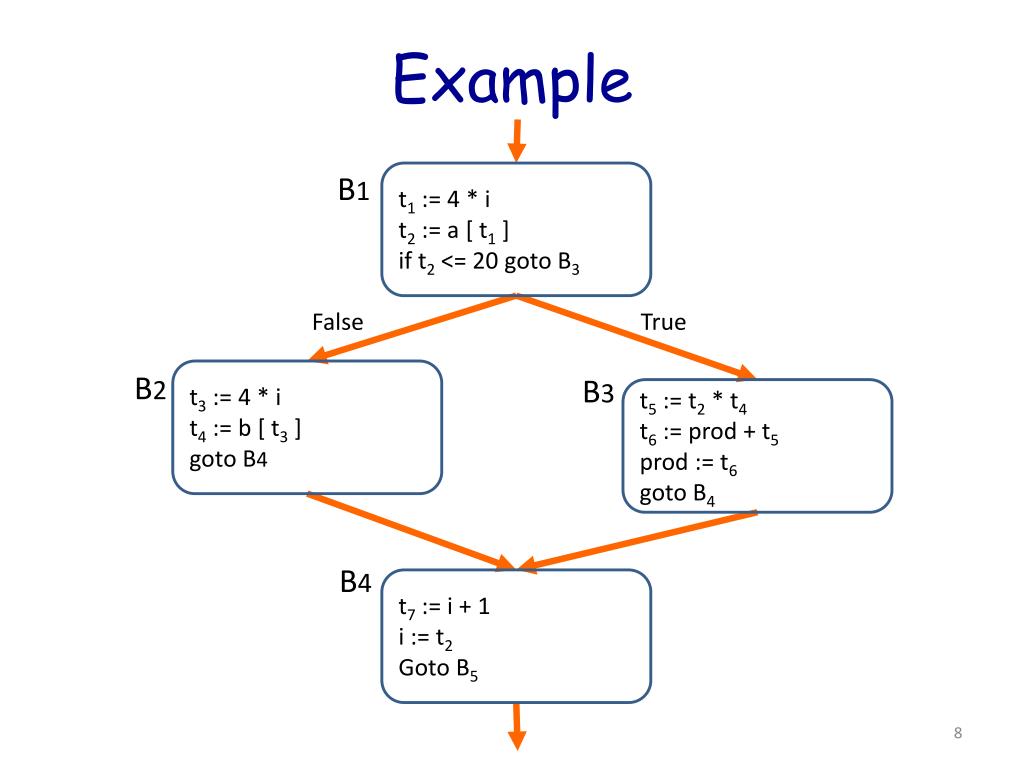 Example B1 t1 := 4 * i t2 := a [ t1 ] if t2 <= 20 gotoB3 False True t3 := 4 * i t4 := b [ t3 ] gotoB4 B2 B3 t5 := t2* t4 t6:= prod + t5 prod := t6 gotoB4 B4 t7:= i + 1 i := t2 Goto B5