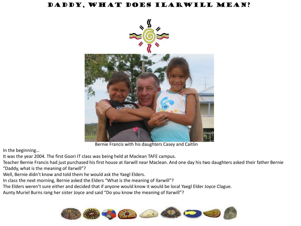 Daddy, what does Ilarwill mean? Bernie Francis with his daughters Casey and Caitlin In the beginning… It was the year 2004. The first Goori IT class was being held at Maclean TAFE campus. Teacher Bernie Francis had just purchased his first house at Ilarwill near Maclean. And one day his two daughters asked their father Bernie “Daddy, what is the meaning of Ilarwill”? Well, Bernie didn’t know and told them he would ask the Yaegl Elders. In class the next morning, Bernie asked the Elders “What is the meaning of Ilarwill”? The Elders weren’t sure either and decided that if anyone would know it would be local Yaegl Elder Joyce Clague. Aunty Muriel Burns rang her sister Joyce and said “Do you know the meaning of Ilarwill”?