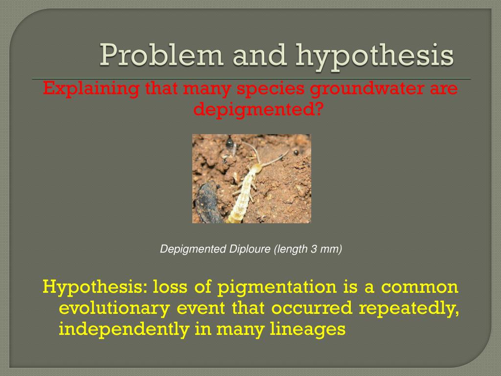 Problem and hypothesis Explaining that many species groundwater are depigmented? Depigmented Diploure (length 3 mm) Hypothesis: loss of pigmentation is a common evolutionary event that occurred repeatedly, independently in many lineages