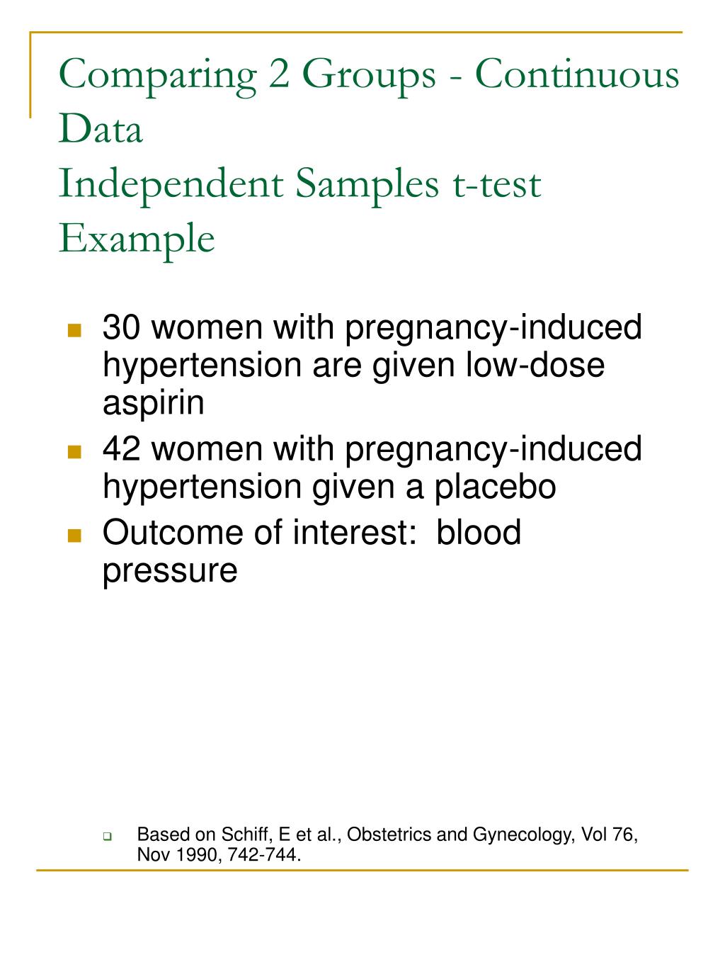 Comparing 2 Groups - Continuous Data Independent Samples t-test Example • 30 women with pregnancy-induced hypertension are given low-dose aspirin • 42 women with pregnancy-induced hypertension given a placebo • Outcome of interest: blood pressure • Based on Schiff, E et al., Obstetrics and Gynecology, Vol 76, Nov 1990, 742-744.