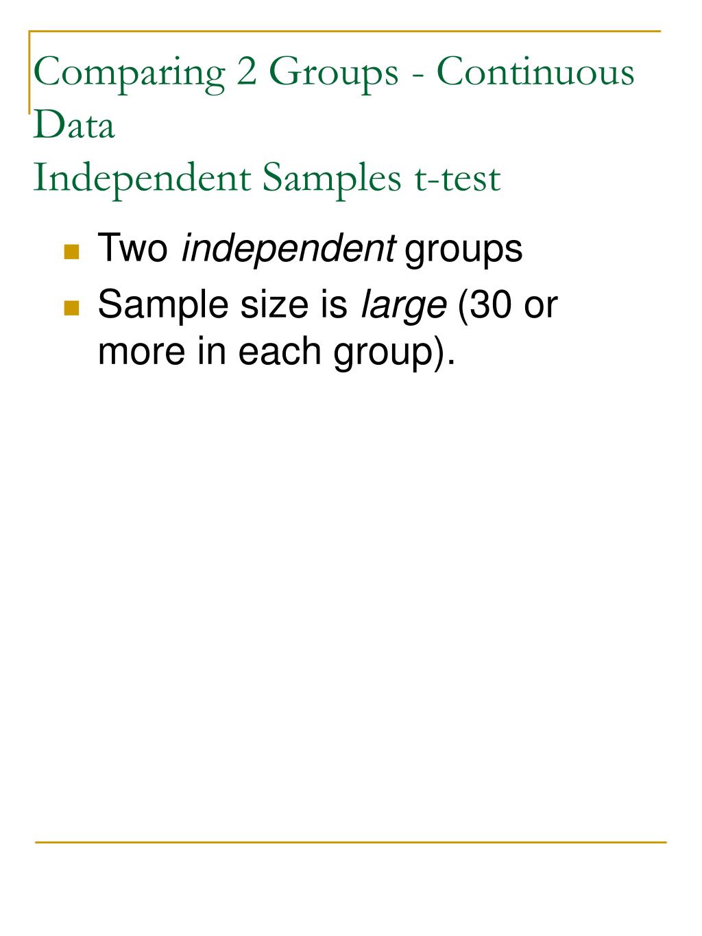 Comparing 2 Groups - Continuous Data Independent Samples t-test • Two independent groups • Sample size is large (30 or more in each group).