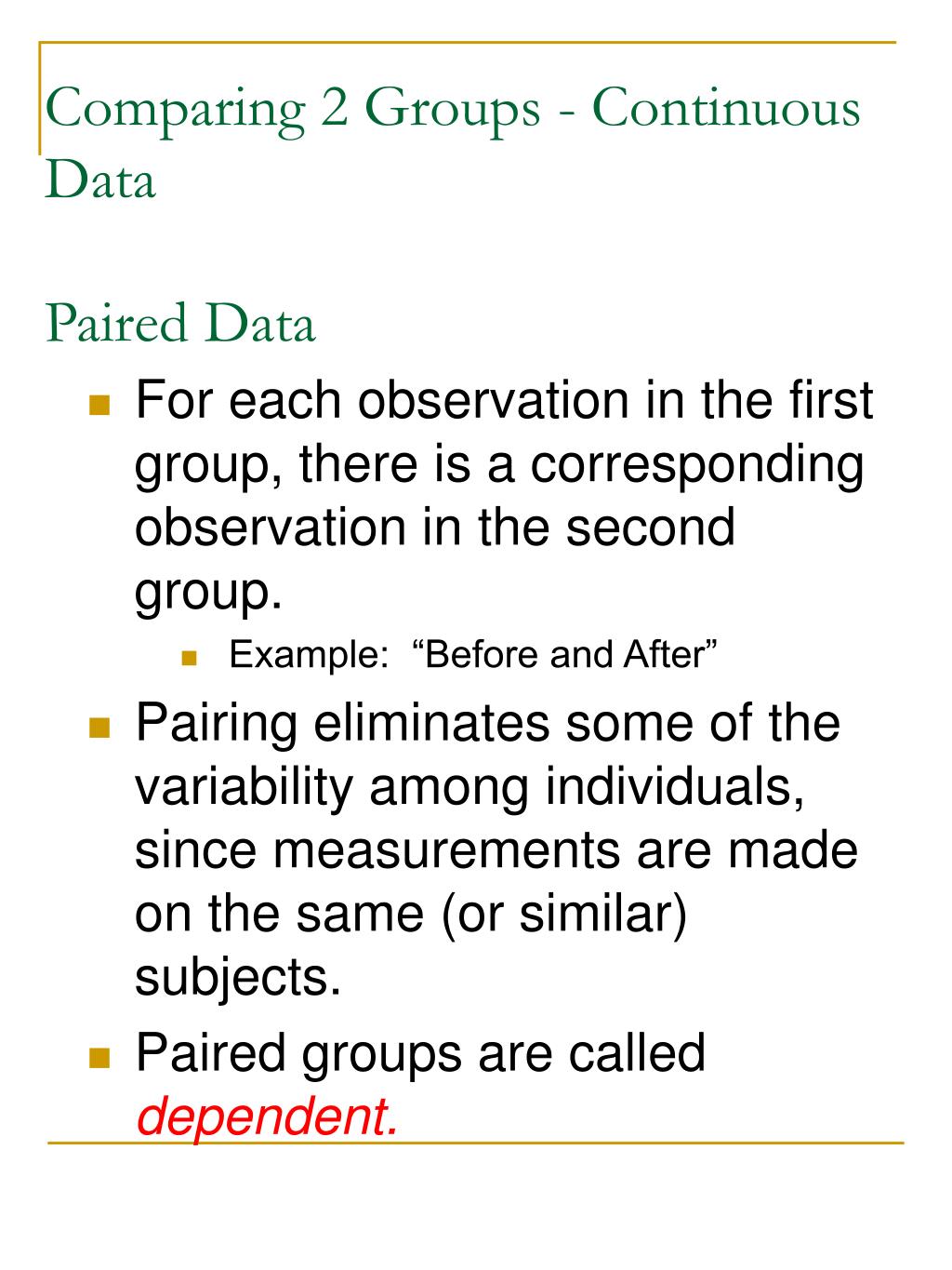 Comparing 2 Groups - Continuous Data Paired Data • For each observation in the first group, there is a corresponding observation in the second group. • Example: “Before and After” • Pairing eliminates some of the variability among individuals, since measurements are made on the same (or similar) subjects. • Paired groups are called dependent.