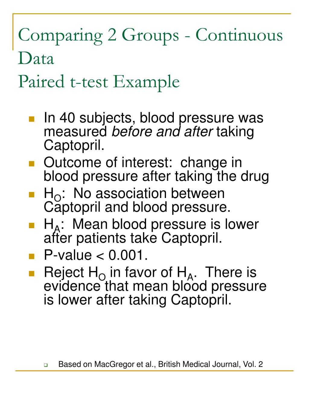 Comparing 2 Groups - Continuous Data Paired t-test Example • In 40 subjects, blood pressure was measured before and after taking Captopril. • Outcome of interest: change in blood pressure after taking the drug • HO: No association between Captopril and blood pressure. • HA: Mean blood pressure is lower after patients take Captopril. • P-value < 0.001. • Reject HO in favor of HA. There is evidence that mean blood pressure is lower after taking Captopril. • Based on MacGregor et al., British Medical Journal, Vol. 2