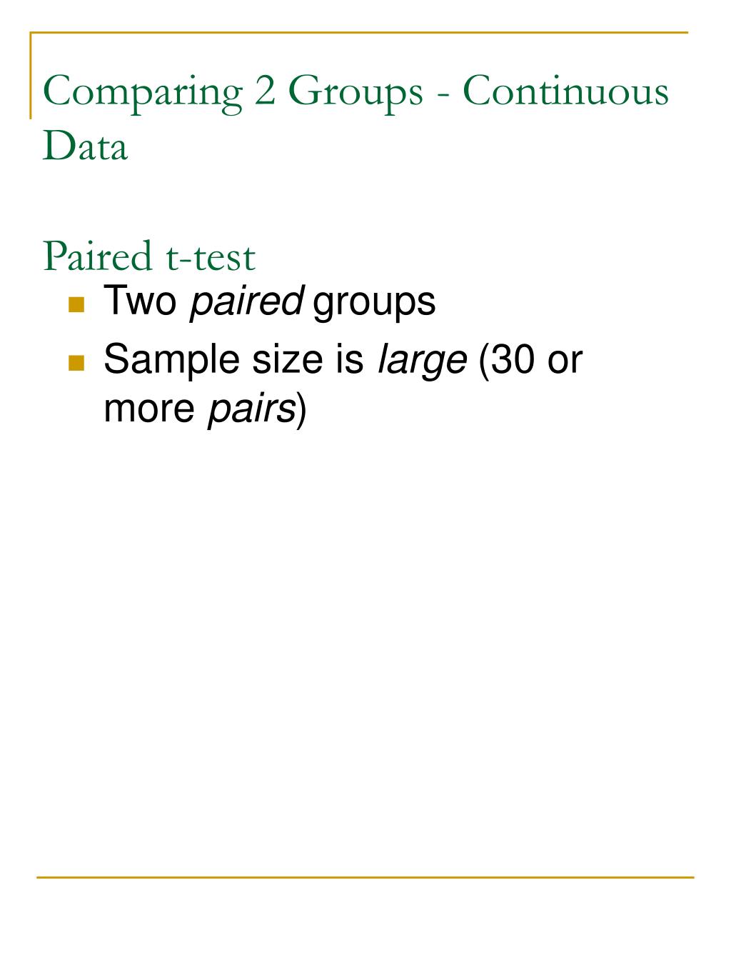 Comparing 2 Groups - Continuous DataPaired t-test • Two paired groups • Sample size is large (30 or more pairs)