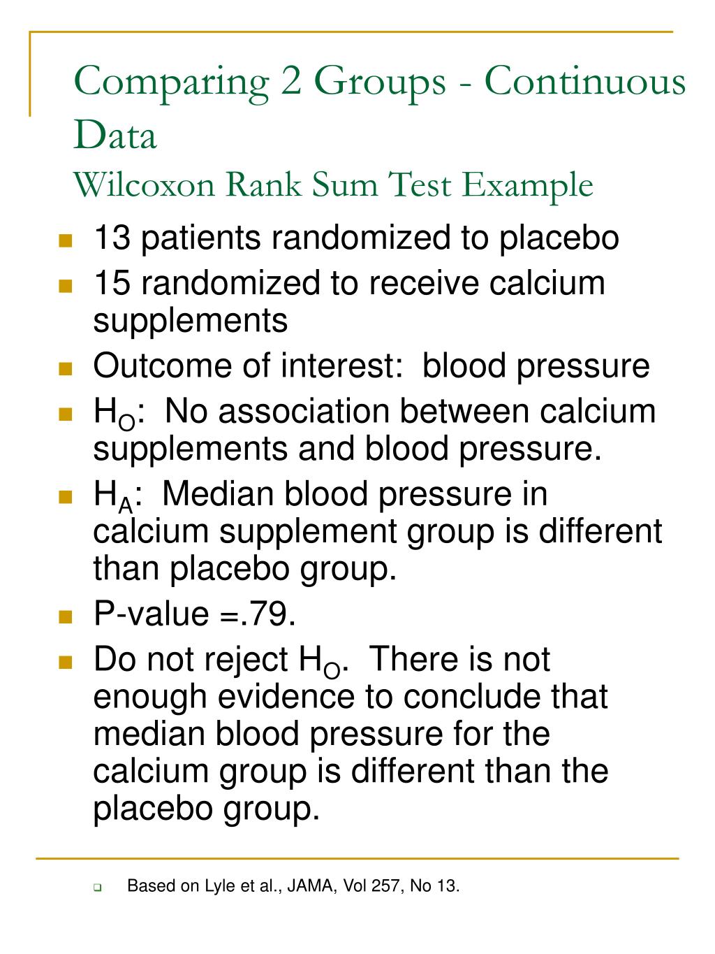 Comparing 2 Groups - Continuous DataWilcoxon Rank Sum Test Example • 13 patients randomized to placebo • 15 randomized to receive calcium supplements • Outcome of interest: blood pressure • HO: No association between calcium supplements and blood pressure. • HA: Median blood pressure in calcium supplement group is different than placebo group. • P-value =.79. • Do not reject HO. There is not enough evidence to conclude that median blood pressure for the calcium group is different than the placebo group. • Based on Lyle et al., JAMA, Vol 257, No 13.