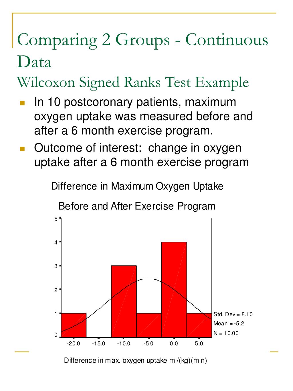 Comparing 2 Groups - Continuous DataWilcoxon Signed Ranks Test Example • In 10 postcoronary patients, maximum oxygen uptake was measured before and after a 6 month exercise program. • Outcome of interest: change in oxygen uptake after a 6 month exercise program