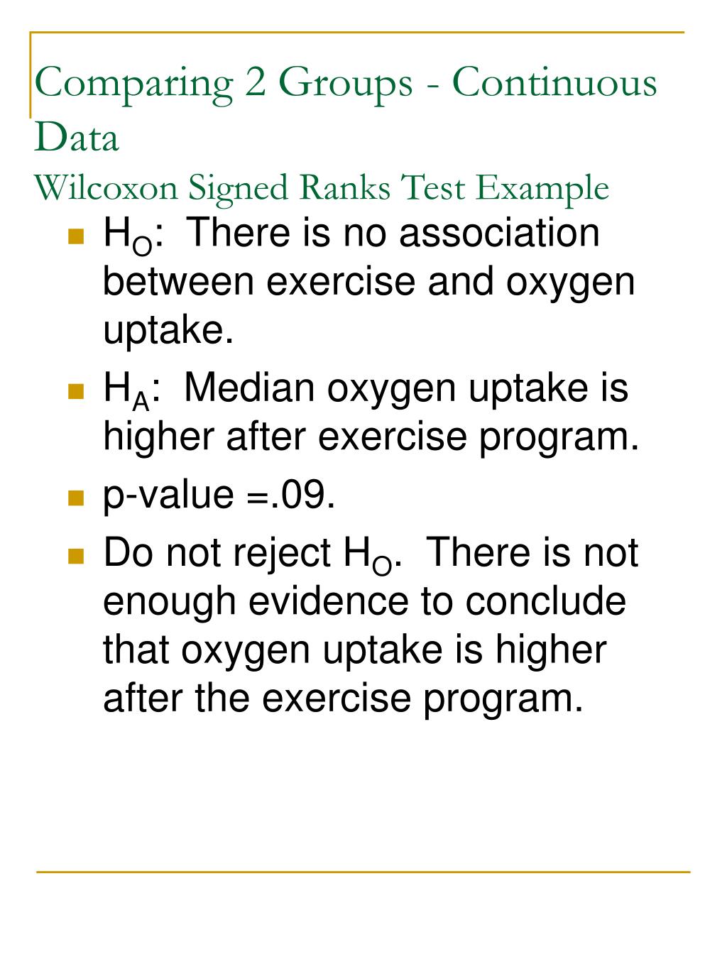 Comparing 2 Groups - Continuous DataWilcoxon Signed Ranks Test Example • HO: There is no association between exercise and oxygen uptake. • HA: Median oxygen uptake is higher after exercise program. • p-value =.09. • Do not reject HO. There is not enough evidence to conclude that oxygen uptake is higher after the exercise program.