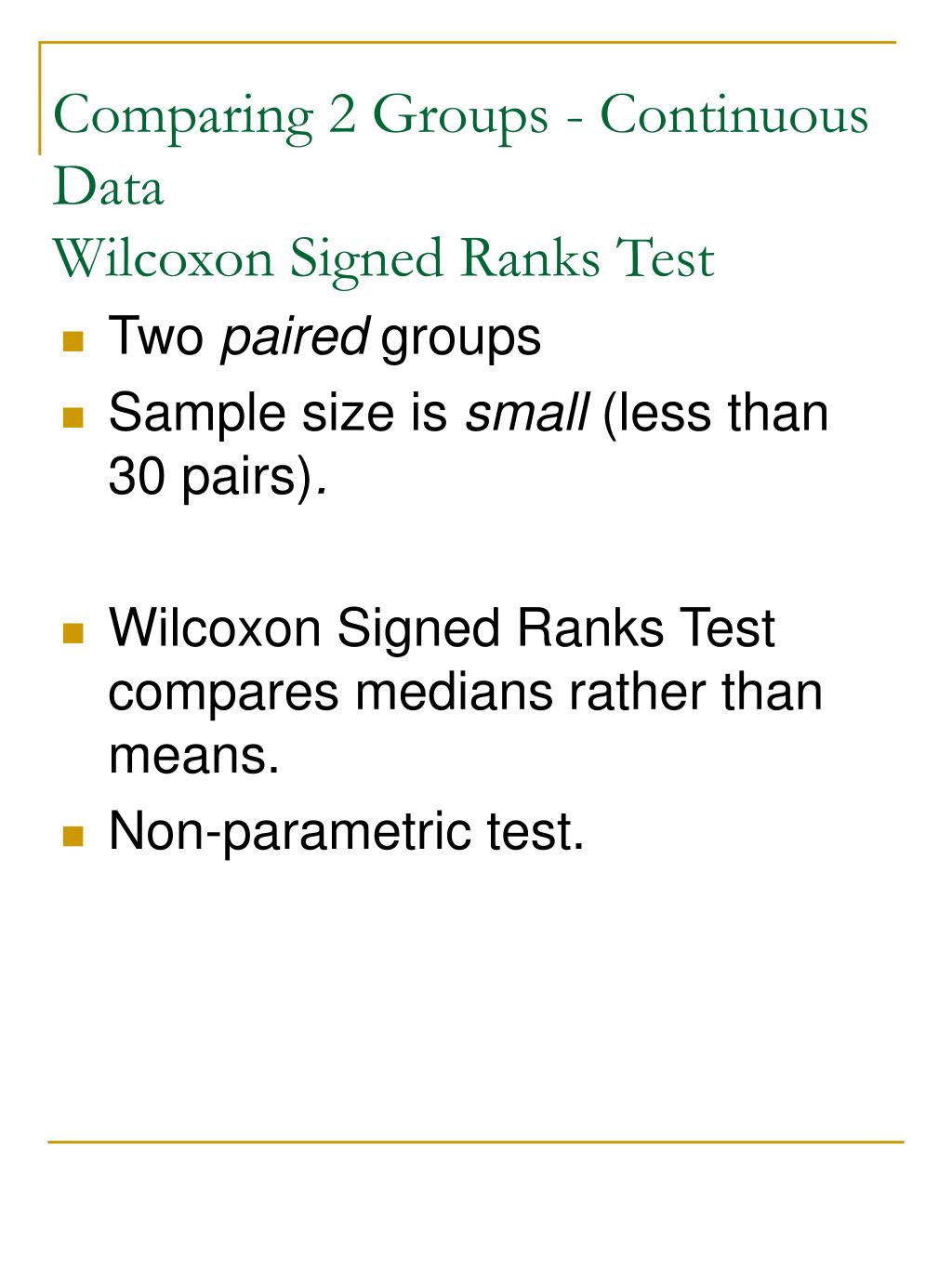 Comparing 2 Groups - Continuous Data Wilcoxon Signed Ranks Test • Two paired groups • Sample size is small (less than 30 pairs). • Wilcoxon Signed Ranks Test compares medians rather than means. • Non-parametric test.