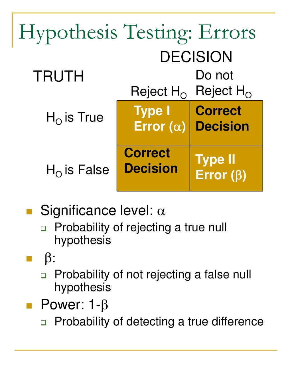 Hypothesis Testing: Errors DECISION TRUTH Do not Reject HO Reject HO • Significance level: a • Probability of rejecting a true null hypothesis • b: • Probability of not rejecting a false null hypothesis • Power: 1-b • Probability of detecting a true difference Type I Error (a) Correct Decision HO is True HO is False Correct Decision Type II Error (b)