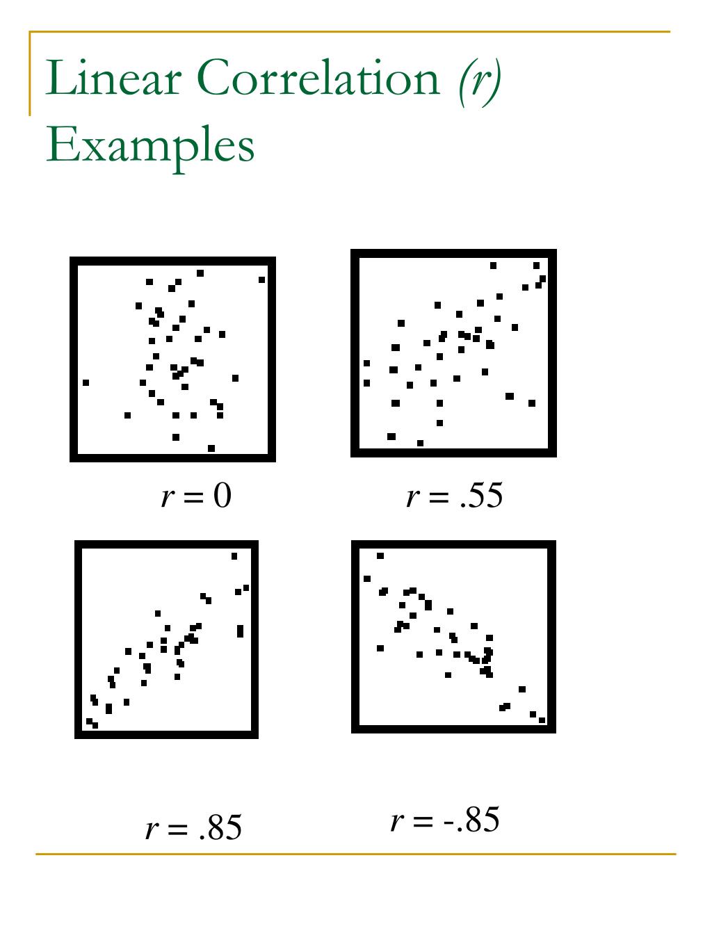 Linear Correlation (r)Examples r = 0 r = .55 r = -.85 r = .85