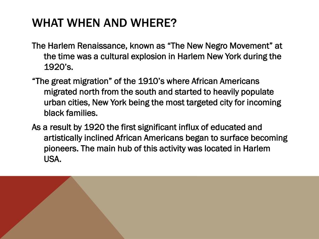 What When and Where? • The Harlem Renaissance, known as “The New Negro Movement” at the time was a cultural explosion in Harlem New York during the 1920’s. • “The great migration” of the 1910’s where African Americans migrated north from the south and started to heavily populate urban cities, New York being the most targeted city for incoming black families. • As a result by 1920 the first significant influx of educated and artistically inclined African Americans began to surface becoming pioneers. The main hub of this activity was located in Harlem USA.