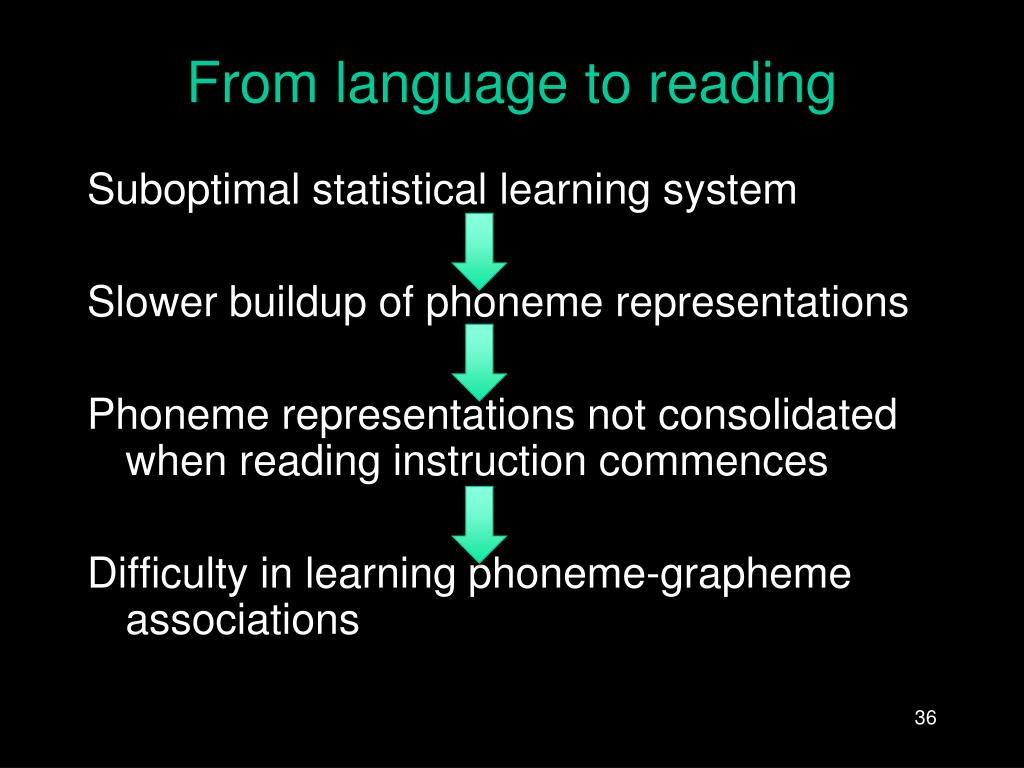 From language to reading Suboptimal statistical learning system Slower buildup of phoneme representations Phoneme representations not consolidated when reading instruction commences Difficulty in learning phoneme-grapheme associations 36