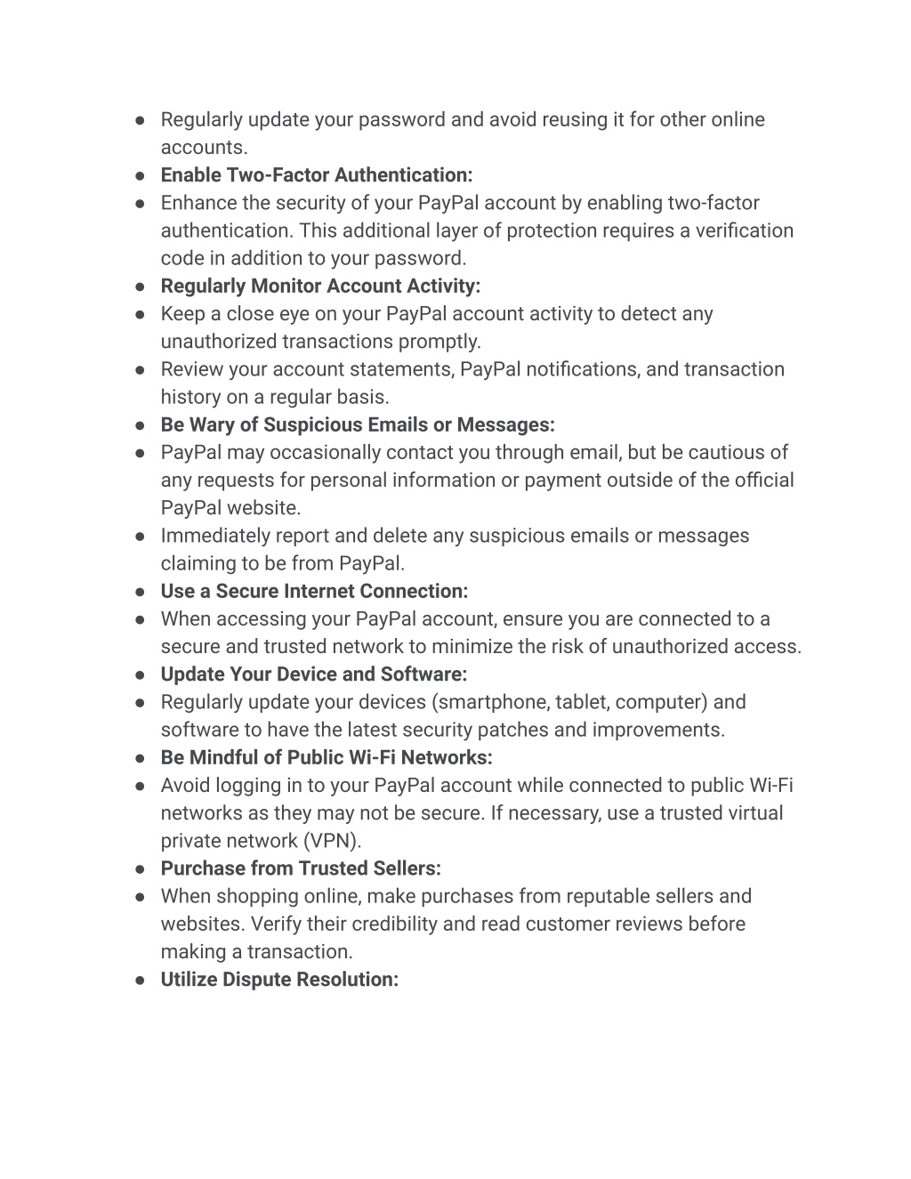 ● Regularly update your password and avoid reusing it for other online accounts. ● Enable Two-Factor Authentication: ● Enhance the security of your PayPal account by enabling two-factor authentication. This additional layer of protection requires a verification code in addition to your password. ● Regularly Monitor Account Activity: ● Keep a close eye on your PayPal account activity to detect any unauthorized transactions promptly. ● Review your account statements, PayPal notifications, and transaction history on a regular basis. ● Be Wary of Suspicious Emails or Messages: ● PayPal may occasionally contact you through email, but be cautious of any requests for personal information or payment outside of the official PayPal website. ● Immediately report and delete any suspicious emails or messages claiming to be from PayPal. ● Use a Secure Internet Connection: ● When accessing your PayPal account, ensure you are connected to a secure and trusted network to minimize the risk of unauthorized access. ● Update Your Device and Software: ● Regularly update your devices (smartphone, tablet, computer) and software to have the latest security patches and improvements. ● Be Mindful of Public Wi-Fi Networks: ● Avoid logging in to your PayPal account while connected to public Wi-Fi networks as they may not be secure. If necessary, use a trusted virtual private network (VPN). ● Purchase from Trusted Sellers: ● When shopping online, make purchases from reputable sellers and websites. Verify their credibility and read customer reviews before making a transaction. ● Utilize Dispute Resolution: