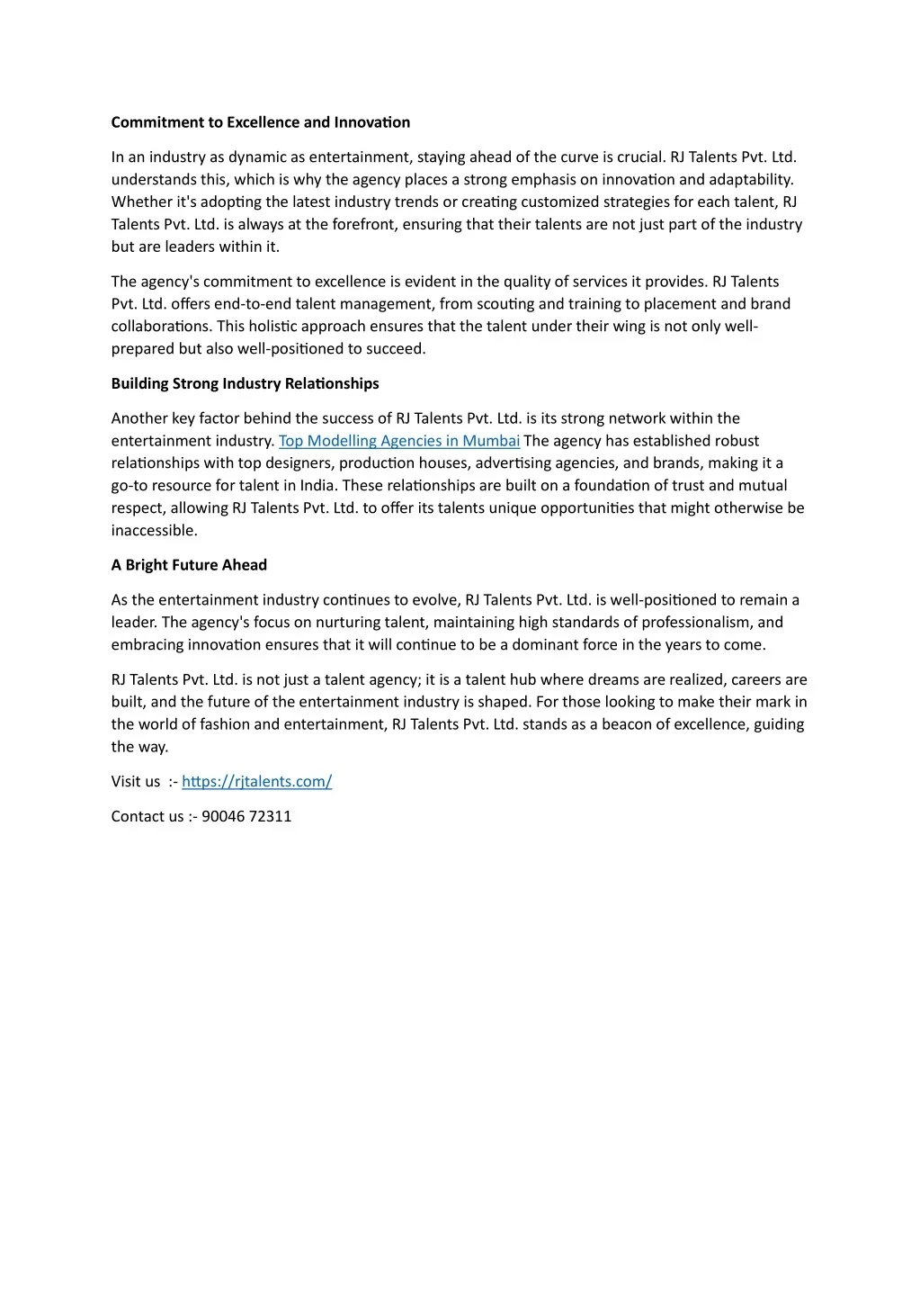 Commitment to Excellence and Innovation In an industry as dynamic as entertainment, staying ahead of the curve is crucial. RJ Talents Pvt. Ltd. understands this, which is why the agency places a strong emphasis on innovation and adaptability. Whether it's adopting the latest industry trends or creating customized strategies for each talent, RJ Talents Pvt. Ltd. is always at the forefront, ensuring that their talents are not just part of the industry but are leaders within it. The agency's commitment to excellence is evident in the quality of services it provides. RJ Talents Pvt. Ltd. offers end-to-end talent management, from scouting and training to placement and brand collaborations. This holistic approach ensures that the talent under their wing is not only well- prepared but also well-positioned to succeed. Building Strong Industry Relationships Another key factor behind the success of RJ Talents Pvt. Ltd. is its strong network within the entertainment industry. Top Modelling Agencies in MumbaiThe agency has established robust relationships with top designers, production houses, advertising agencies, and brands, making it a go-to resource for talent in India. These relationships are built on a foundation of trust and mutual respect, allowing RJ Talents Pvt. Ltd. to offer its talents unique opportunities that might otherwise be inaccessible. A Bright Future Ahead As the entertainment industry continues to evolve, RJ Talents Pvt. Ltd. is well-positioned to remain a leader. The agency's focus on nurturing talent, maintaining high standards of professionalism, and embracing innovation ensures that it will continue to be a dominant force in the years to come. RJ Talents Pvt. Ltd. is not just a talent agency; it is a talent hub where dreams are realized, careers are built, and the future of the entertainment industry is shaped. For those looking to make their mark in the world of fashion and entertainment, RJ Talents Pvt. Ltd. stands as a beacon of excellence, guiding the way. Visit us :- https://rjtalents.com/ Contact us :-90046 72311