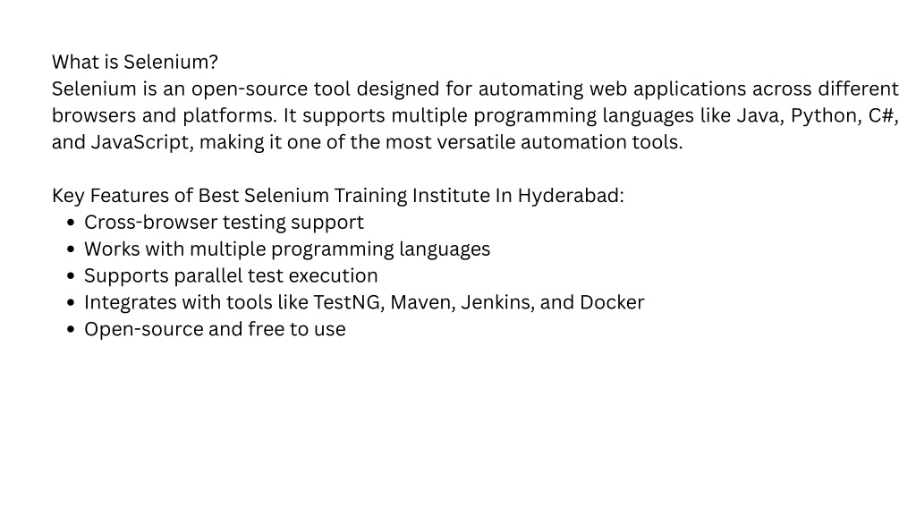 3. What is Selenium? Selenium is an open-source tool designed for automating web applications across different browsers and platforms. It supports multiple programming languages like Java, Python, C#, and JavaScript, making it one of the most versatile automation tools. Key Features of Best Selenium Training Institute In Hyderabad: Cross-browser testing support Works with multiple programming languages Supports parallel test execution Integrates with tools like TestNG, Maven, Jenkins, and Docker Open-source and free to use