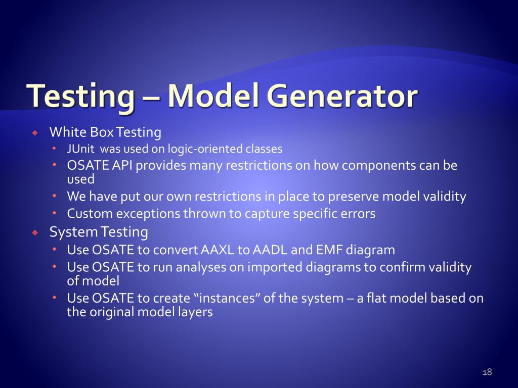 Testing – Model Generator • White Box Testing • JUnit was used on logic-oriented classes • OSATE API provides many restrictions on how components can be used • We have put our own restrictions in place to preserve model validity • Custom exceptions thrown to capture specific errors • System Testing • Use OSATE to convert AAXL to AADL and EMF diagram • Use OSATE to run analyses on imported diagrams to confirm validity of model • Use OSATE to create “instances” of the system – a flat model based on the original model layers
