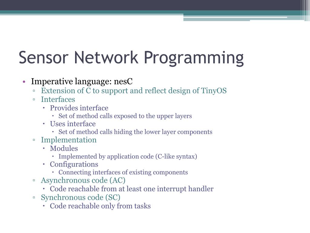 Sensor Network Programming • Imperative language: nesC • Extension of C to support and reflect design of TinyOS • Interfaces • Provides interface • Set of method calls exposed to the upper layers • Uses interface • Set of method calls hiding the lower layer components • Implementation • Modules • Implemented by application code (C-like syntax) • Configurations • Connecting interfaces of existing components • Asynchronous code (AC) • Code reachable from at least one interrupt handler • Synchronous code (SC) • Code reachable only from tasks