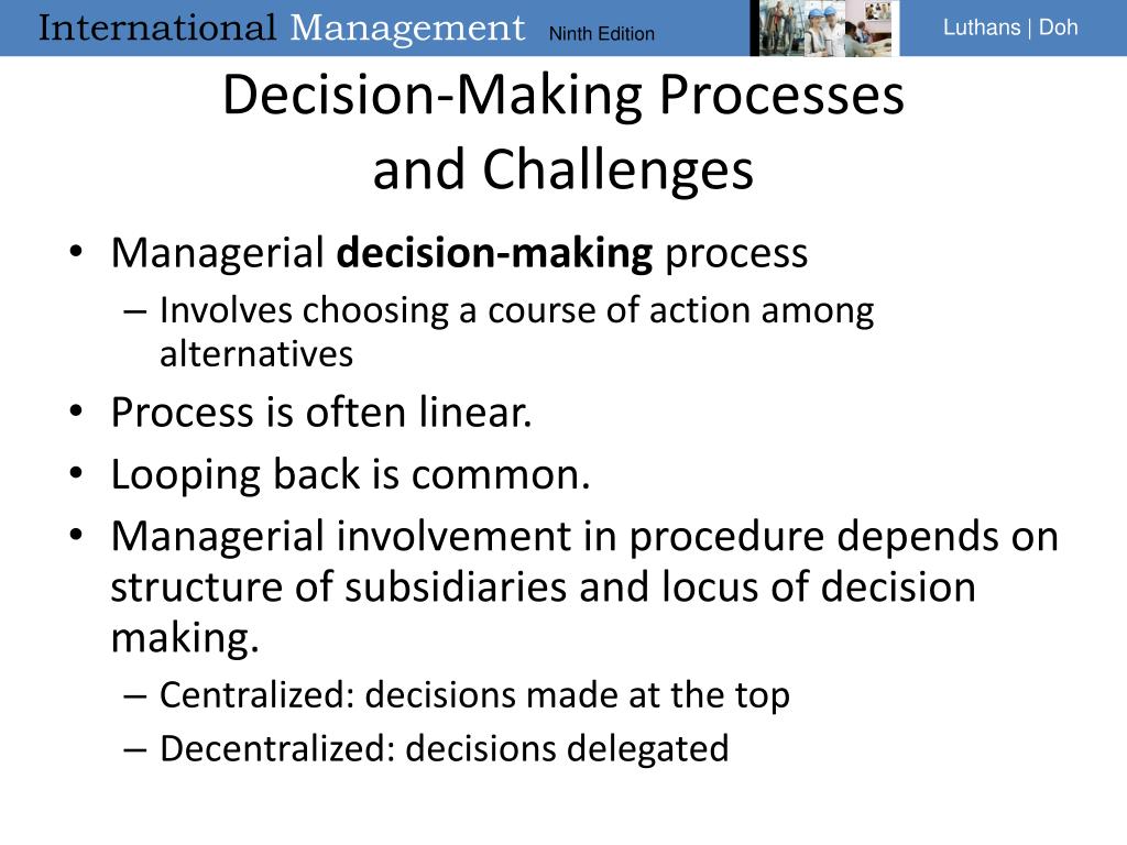 Decision-Making Processes and Challenges • Managerial decision-making process • Involves choosing a course of action among alternatives • Process is often linear. • Looping back is common. • Managerial involvement in procedure depends on structure of subsidiaries and locus of decision making. • Centralized: decisions made at the top • Decentralized: decisions delegated