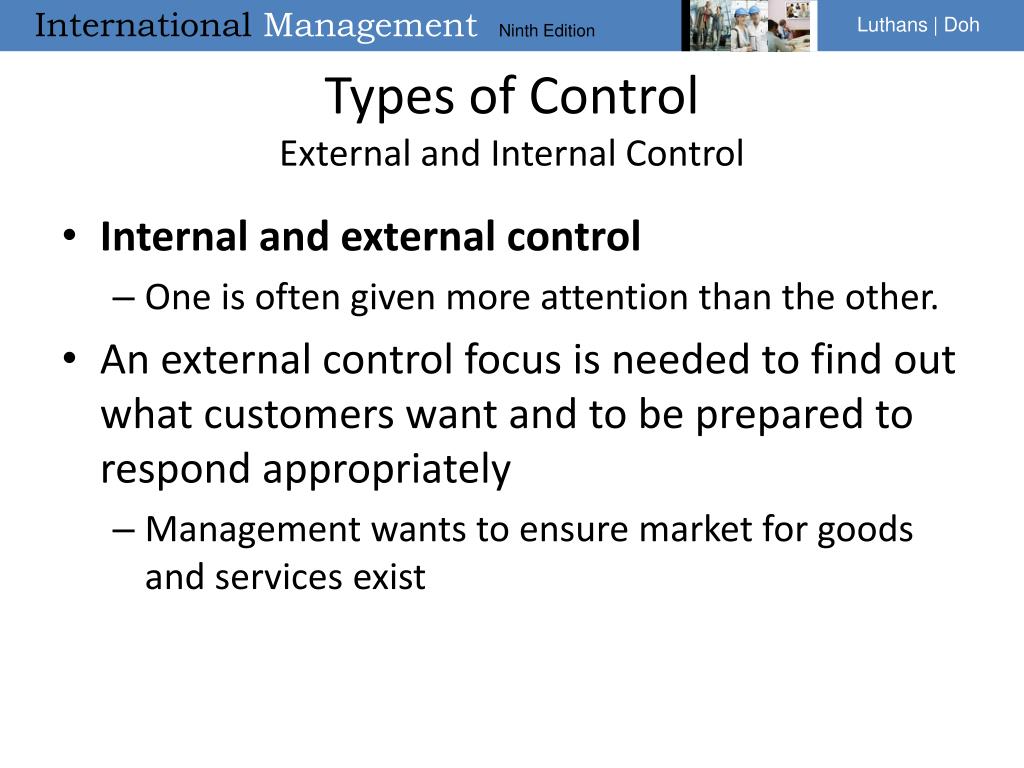 Types of ControlExternal and Internal Control • Internal and external control • One is often given more attention than the other. • An external control focus is needed to find out what customers want and to be prepared to respond appropriately • Management wants to ensure market for goods and services exist