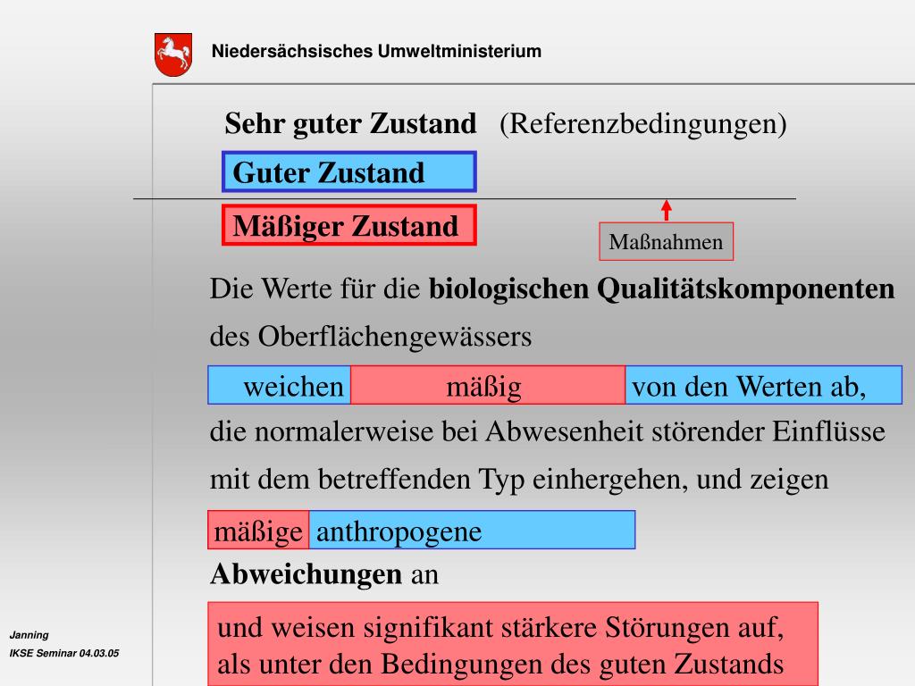 Maßnahmen Sehr guter Zustand (Referenzbedingungen) Guter Zustand Mäßiger Zustand Die Werte für die biologischen Qualitätskomponenten des Oberflächengewässers entsprechen den Werten, die normalerweise bei Abwesenheit störender Einflüsse mit dem betreffenden Typ einhergehen, und zeigen keine oder nur sehr geringfügige Abweichungen an weichen nur in geringem Maße von den Werten ab, mäßig geringe anthropogene mäßige und weisen signifikant stärkere Störungen auf, als unter den Bedingungen des guten Zustands