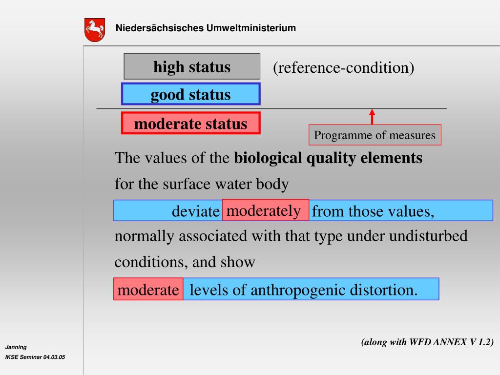 Programme of measures high status (reference-condition) good status moderate status The values of the biological quality elements for the surface water body reflect those values normally associated with that type under undisturbed conditions, and show no, or only very minor,evidence of distortion. moderately deviate only slightly from those values, low levels of anthropogenic distortion. moderate (along with WFD ANNEX V 1.2)