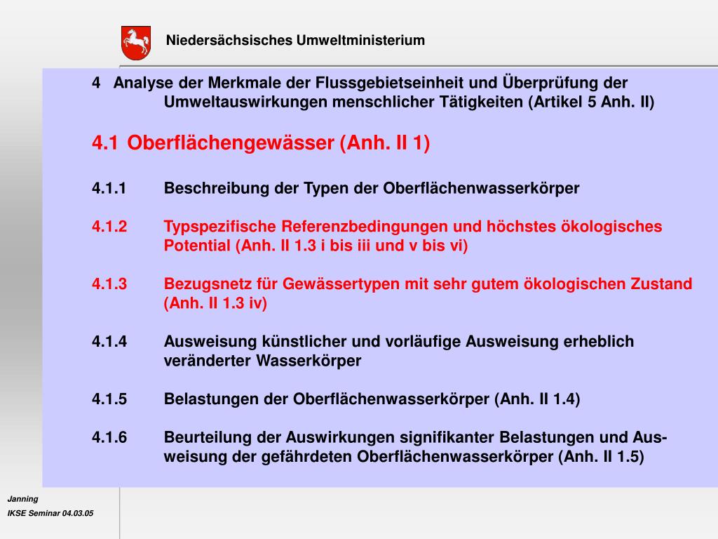 4 Analyse der Merkmale der Flussgebietseinheit und Überprüfung der Umweltauswirkungen menschlicher Tätigkeiten (Artikel 5 Anh. II) 4.1 Oberflächengewässer (Anh. II 1) 4.1.1 Beschreibung der Typen der Oberflächenwasserkörper 4.1.2 Typspezifische Referenzbedingungen und höchstes ökologisches Potential (Anh. II 1.3 i bis iii und v bis vi) 4.1.3 Bezugsnetz für Gewässertypen mit sehr gutem ökologischen Zustand (Anh. II 1.3 iv) 4.1.4 Ausweisung künstlicher und vorläufige Ausweisung erheblich veränderter Wasserkörper 4.1.5 Belastungen der Oberflächenwasserkörper (Anh. II 1.4) 4.1.6 Beurteilung der Auswirkungen signifikanter Belastungen und Aus- weisung der gefährdeten Oberflächenwasserkörper (Anh. II 1.5)