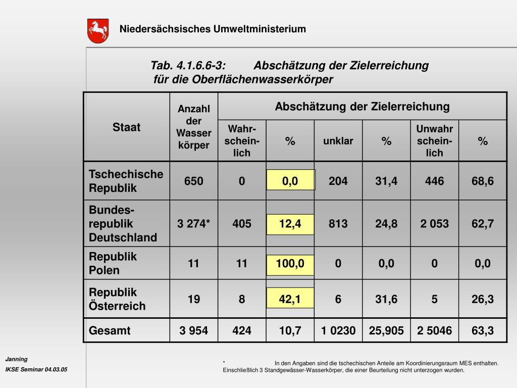 Tab. 4.1.6.6-3: Abschätzung der Zielerreichung für die Oberflächenwasserkörper * In den Angaben sind die tschechischen Anteile am Koordinierungsraum MES enthalten.Einschließlich 3 Standgewässer-Wasserkörper, die einer Beurteilung nicht unterzogen wurden.