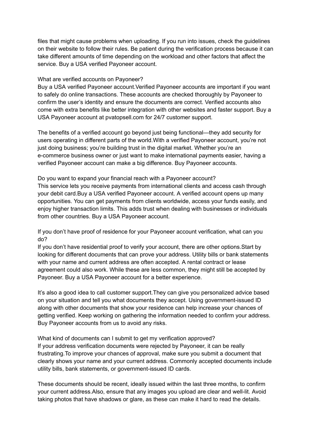2. files that might cause problems when uploading. If you run into issues, check the guidelines on their website to follow their rules. Be patient during the verification process because it can take different amounts of time depending on the workload and other factors that affect the service. Buy a USA verified Payoneer account. What are verified accounts on Payoneer? Buy a USA verified Payoneer account.Verified Payoneer accounts are important if you want to safely do online transactions. These accounts are checked thoroughly by Payoneer to confirm the user’s identity and ensure the documents are correct. Verified accounts also come with extra benefits like better integration with other websites and faster support. Buy a USA Payoneer account at pvatopsell.com for 24/7 customer support. The benefits of a verified account go beyond just being functional—they add security for users operating in different parts of the world.With a verified Payoneer account, you’re not just doing business; you’re building trust in the digital market. Whether you’re an e-commerce business owner or just want to make international payments easier, having a verified Payoneer account can make a big difference. Buy Payoneer accounts. Do you want to expand your financial reach with a Payoneer account? This service lets you receive payments from international clients and access cash through your debit card.Buy a USA verified Payoneer account. A verified account opens up many opportunities. You can get payments from clients worldwide, access your funds easily, and enjoy higher transaction limits. This adds trust when dealing with businesses or individuals from other countries. Buy a USA Payoneer account. If you don’t have proof of residence for your Payoneer account verification, what can you do? If you don’t have residential proof to verify your account, there are other options.Start by looking for different documents that can prove your address. Utility bills or bank statements with your name and current address are often accepted. A rental contract or lease agreement could also work. While these are less common, they might still be accepted by Payoneer. Buy a USA Payoneer account for a better experience. It’s also a good idea to call customer support.They can give you personalized advice based on your situation and tell you what documents they accept. Using government-issued ID along with other documents that show your residence can help increase your chances of getting verified. Keep working on gathering the information needed to confirm your address. Buy Payoneer accounts from us to avoid any risks. What kind of documents can I submit to get my verification approved? If your address verification documents were rejected by Payoneer, it can be really frustrating.To improve your chances of approval, make sure you submit a document that clearly shows your name and your current address. Commonly accepted documents include utility bills, bank statements, or government-issued ID cards. These documents should be recent, ideally issued within the last three months, to confirm your current address.Also, ensure that any images you upload are clear and well-lit. Avoid taking photos that have shadows or glare, as these can make it hard to read the details.