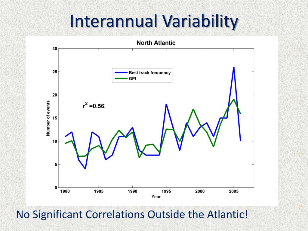Random Seeding/Natural Selection Step 1: Seed each ocean basin with a very large number of weak, randomly located cyclones Step 2: Cyclones are assumed to move with the large scale atmospheric flow in which they are embedded, plus a correction for beta drift Step 3: Run the CHIPS model for each cyclone, and note how many achieve at least tropical storm strength Step 4: Using the small fraction of surviving events, determine storm statistics. Details: Emanuel et al., BAMS, 2008