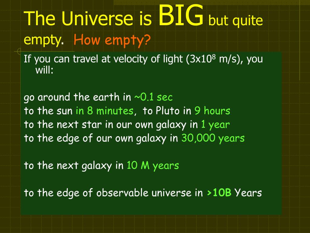 The Universe is BIG but quite empty. How empty? If you can travel at velocity of light (3x108 m/s), you will: go around the earth in ~0.1 sec to the sun in 8 minutes, to Pluto in 9 hours to the next star in our own galaxy in 1 year to the edge of our own galaxy in 30,000 years to the next galaxy in 10 M years to the edge of observable universe in >10B Years