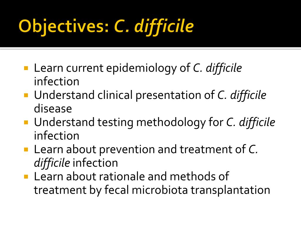 Objectives: C. difficile • Learn current epidemiology of C. difficile infection • Understand clinical presentation of C. difficile disease • Understand testing methodology for C. difficile infection • Learn about prevention and treatment of C. difficile infection • Learn about rationale and methods of treatment by fecal microbiota transplantation