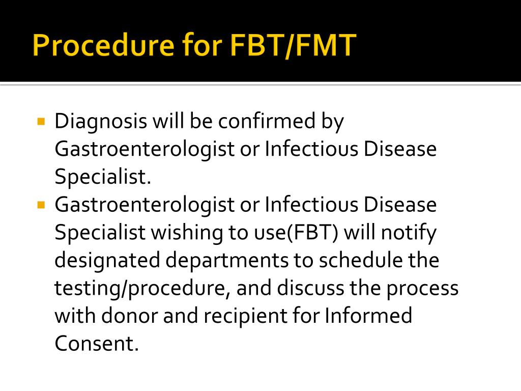 Procedure for FBT/FMT • Diagnosis will be confirmed by Gastroenterologist or Infectious Disease Specialist. • Gastroenterologist or Infectious Disease Specialist wishing to use(FBT) will notify designated departments to schedule the testing/procedure, and discuss the process with donor and recipient for Informed Consent.