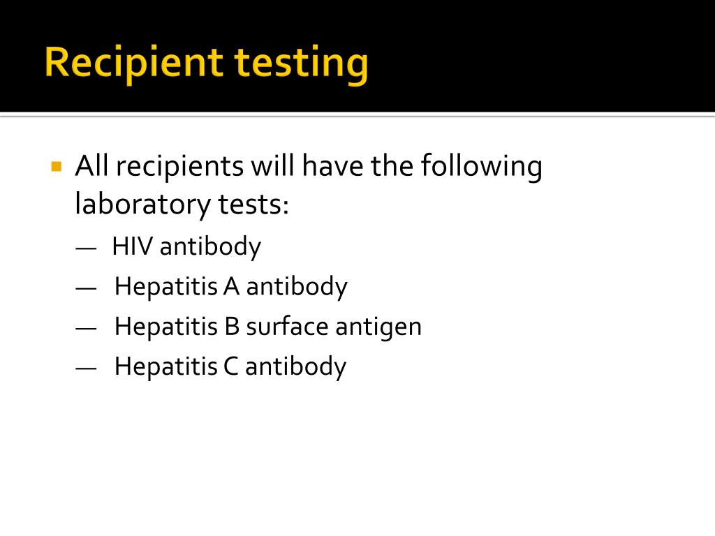Recipient testing • All recipients will have the following laboratory tests: • HIV antibody • Hepatitis A antibody • Hepatitis B surface antigen • Hepatitis C antibody