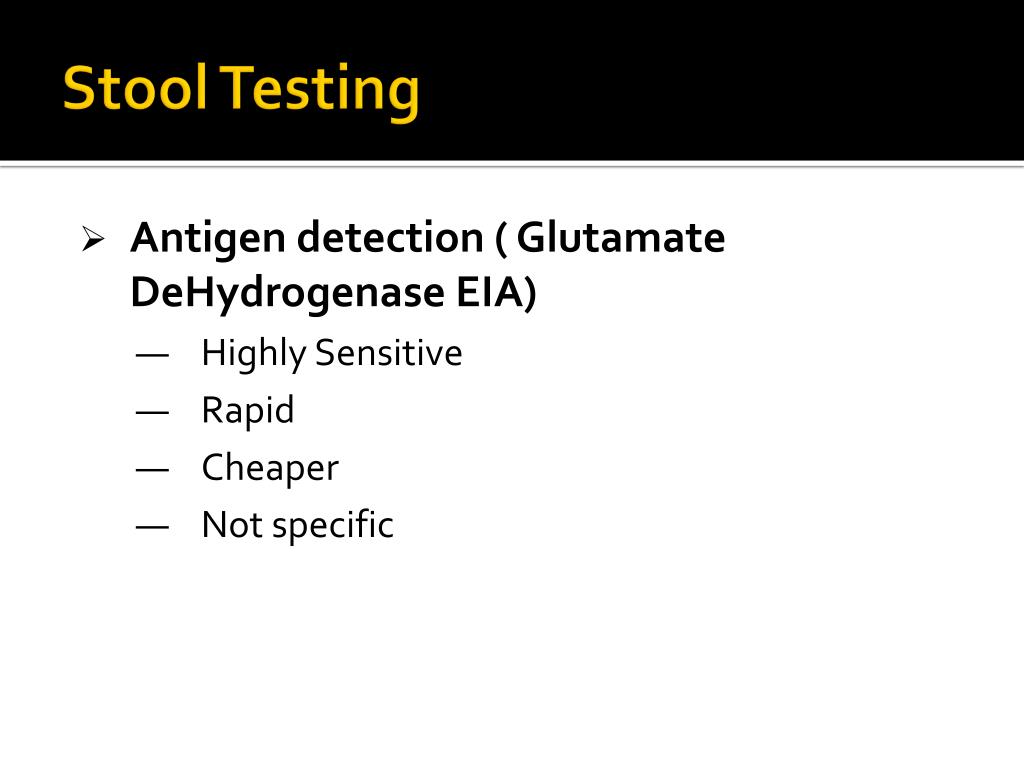 Stool Testing • Antigen detection ( Glutamate DeHydrogenase EIA) • Highly Sensitive • Rapid • Cheaper • Not specific