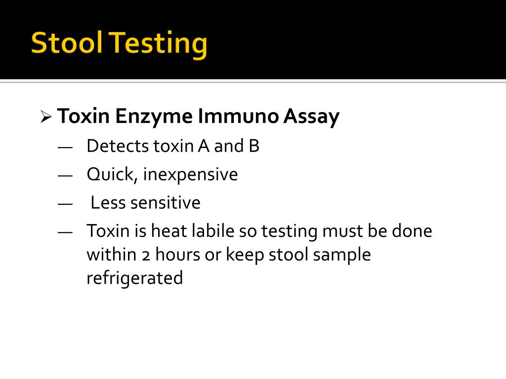 Stool Testing • Toxin Enzyme Immuno Assay • Detects toxin A and B • Quick, inexpensive • Less sensitive • Toxin is heat labile so testing must be done within 2 hours or keep stool sample refrigerated