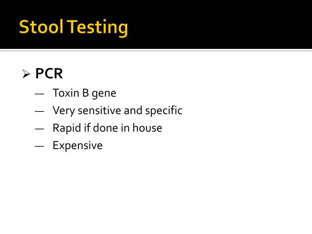Stool Testing • PCR • Toxin B gene • Very sensitive and specific • Rapid if done in house • Expensive